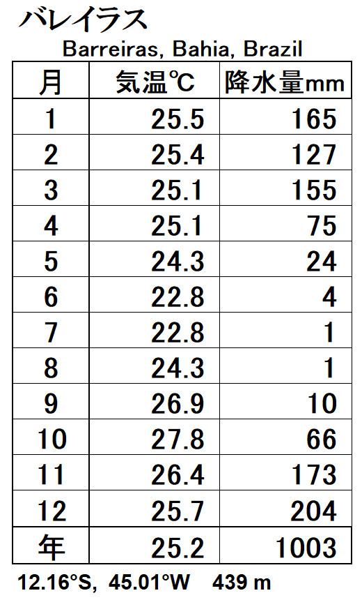 バイア州南西部、サンフランシスコ川上流域にひろがるカンポセラードを空から見た景観である。 カンポセラード(Campo cerrado)はブラジル高原のサバナ原野のこと。 セラードは草原の中に背の低い木が分散して生えた、疎林などとも言われる植生である。 右の表のとおり、撮影した7月末は、5月から9月まで続くほとんど雨のない乾季の最中で、落葉樹はすべて落葉している。 しかし、セラードには、地中深くまで張った根で水分を得て常緑を保つ樹種もあり、写真には緑のところもかなり見える。 写真中央部から右端にかけて細長い台地(シャパーダ)があり、それ以外はすべて緩やかに波打った低地である。 台地を取り巻く崖には、赤みを帯びたキャップロック(台地表面をつくる侵食されにくい地層)が露出している。 この付近には、このような小さな台地がいくつも分布している。 この台地は前ページの写真の台地と同じサンフランシスコ川台地の一部で、透水性の砂岩層からなっている。 かつては、この辺一帯にこの地層からなる台地がひろがっていたと思われるが、侵食*1)が進んでこのように小さな台地になってしまった。 そのプロセスは、堆積岩台地(シャパーダ)のできるまでの説明のとおりである。 *1) このような透水性のキャップロックの台地の場合、台地を縮小して行く「侵食」は川による侵食ではない。