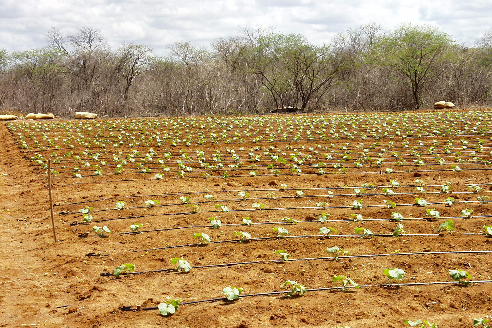 このような気候下では、灌漑施設なしには安定した農業は不可能なので、この農場では、1000m を超える深井戸の地下水を使って、大規模なメロン栽培をしている。 この畑では、各畝沿いに設置したホースから水を少しずつ点滴するドリップ灌漑をしている。 この深井戸はブラジル石油公社(ペトロブラス社)が石油のために掘ったが、石油や天然ガスは出ず、50℃近い温水が噴出、それを払い下げてもらったものである。 灌漑には温水でも問題ないらしい